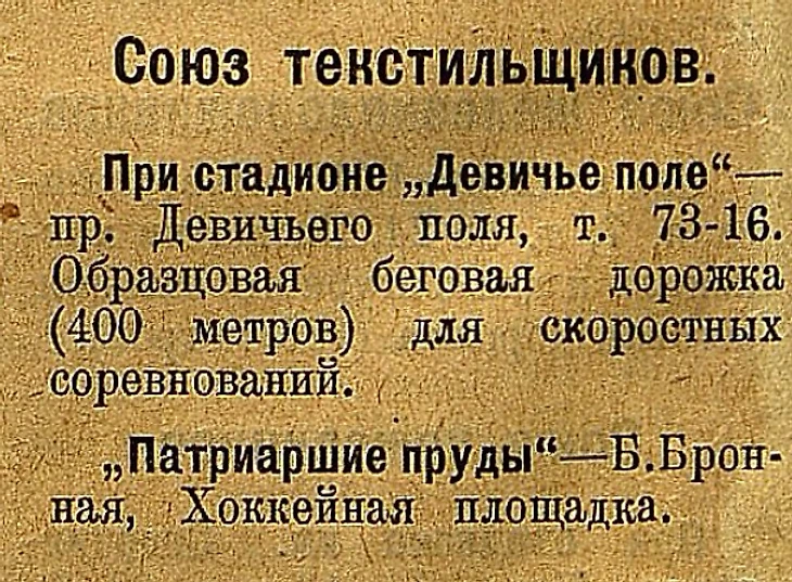 1928 год. Катки Союза текстильщиков «Патриаршие пруды» и «Девичье поле» (справочник-путеводитель «Спортивная Москва», составитель М.Б. Чесноков, 1928 год)
