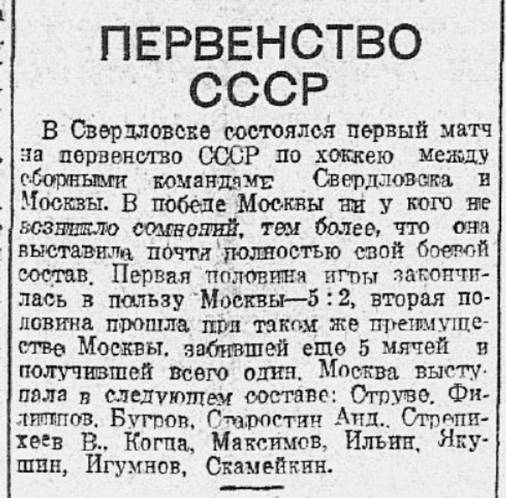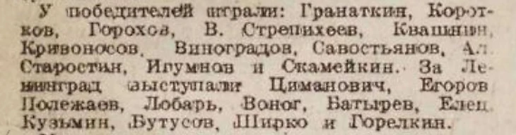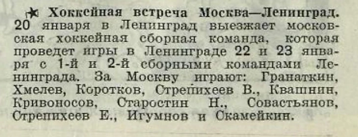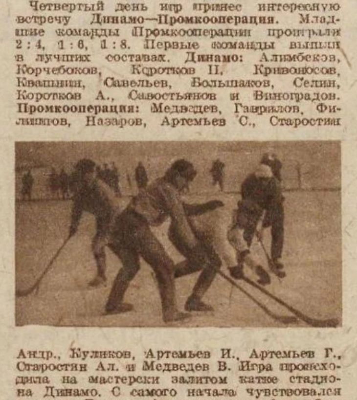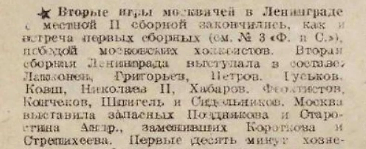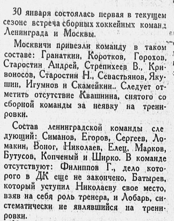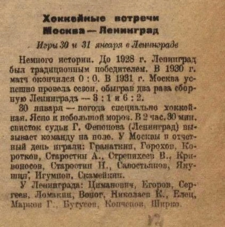 «30 января хоккейные игры состоялось без участия первых команд ввиду отъезда сборной в Ленинград» (журнал «Физкультура и спорт» № 7 за март 1932 года).