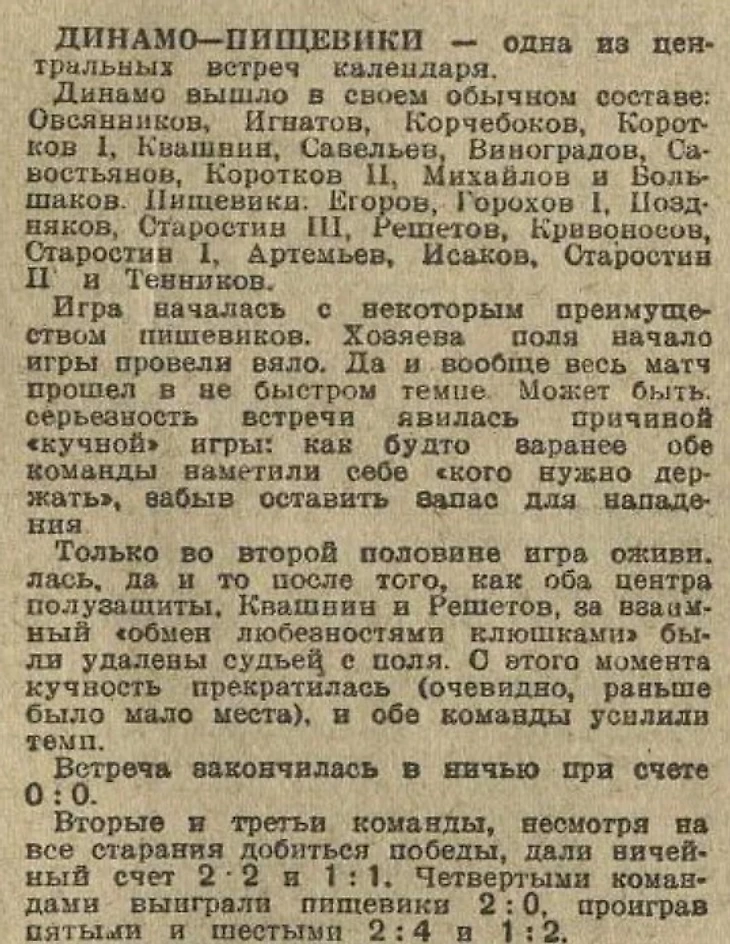 «Динамо» - «Пищевики» - одна из центральных встреч календаря. «Динамо» вышло в своем обычном составе: Овсянников, Игнатов, Корчебоков, Коротков I, Квашнин, Савельев, Виноградов, Савостьянов, Коротков II, Михайлов и Большаков. «Пищевики»: Егоров, Горохов I, Поздняков, Старостин III, Решетов, Кривоносов, Старостин I, Артемьев, Исаков, Старостин II и Тенников. Игра началась с некоторым преимуществом «Пищевиков». Хозяева поля начало игры провели вяло. Да и вообще весь матч прошел в не быстром темпе Может быть, серьезность встречи явилась причиной «кучной» игры: как будто заранее обе команды наметили себе «кого нужно держать», забыв оставить запас для нападения. Только во второй половине игра оживилась, да и то после того, как оба центра полузащиты, Квашнин и Решетов, за взаимный «обмен любезностями клюшками» были удалены судьей с поля. С этого момента кучность прекратилась (очевидно, раньше было мало места), и обе команды усилили темп. Встреча закончилась в ничью при счете 0:0» (журнал «Физкультура и спорт» № 4 за 20 января 1930 года).