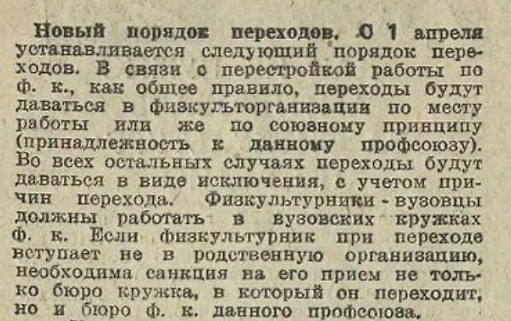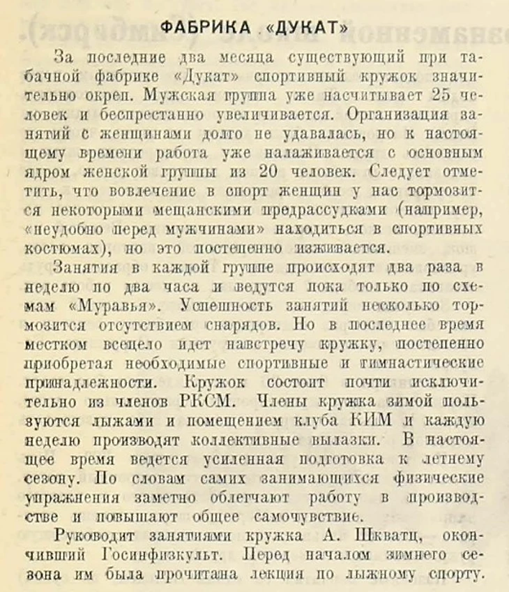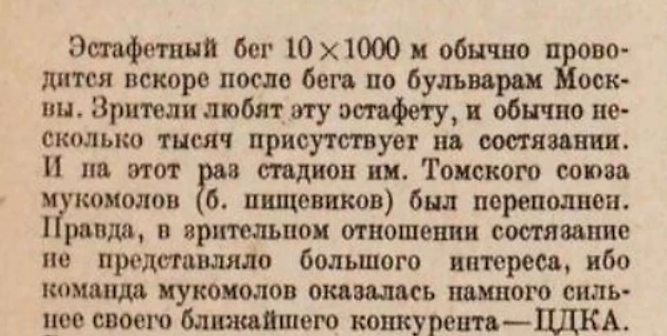 «Вся физкультурная общественность Советского Союза должна знать о тех безобразных явлениях и перегибах, которыми сопровождалась перестройка работы на стадионе пищевиков им. Томского. Не случайно, что бывшая физкультурная база московских пищевиков - стадион им. Томского - снова в центре внимания всей физкультурной общественности. Старое не сдается без боя... А на стадионе Томского от старого еще далеко не освободились. <...> Что же такое произошло у пищевиков? Они объявили кружок стадиона им. Томского распущенным. Ведь пищевики «за перестройку... Это - дело полезное»... Это - слова... А дела? Дела разошлись со словами так далеко, что потребовалось организовать выездное заседание* президиума бюро ф. к. МОСПС на ф-ку «Дукат». <...> Мало было самокритики в докладе пред. облбюро ф. к. тов. Ларина о ходе перестройки по союзу пищевиков. По его словам, у пищевиков «все благополучно», все спокойно, сопротивление перестройки изжито, коллективы ф. к. «бурно растут» (было 21, стало 32; в то время как союз обслуживает 260 предприятий). <...> Целый ряд руководящих работников по ф. к. заострил внимание в своих выступлениях на фактах безобразного извращения принципа перестройки у пищевиков. <...> «Скверно у нас получилось с перестройкой на стадионе Томского. Прямо вышло «разделение труда»: «Ява» получила лыжников - мужчин и женщин, «Дукат» - хоккеистов, а «Большевик» хоккеисток...» <...> «Ошибку сделали общественные организации «Дуката», проглядевшие грубейшее извращение принципа перестройки и допустившие прикрепление к «Дукату» пищевиковских чемпионов-хоккеистов и футболистов в погоне за поднятие спортивного интереса у рабочих». <...> «На «Дукате» уже налицо все признаки начала узко-спортивной работы, погони за тем, чтобы выиграть во что бы то ни стало... Вот один из первых «плодов» извращения перестройки...» <...> «Облбюро ф. к. пищевиков допустило опошление самого принципа перестройки. На его глазах пачками шло прикрепление физкультурников других союзов на ф-ку «Дукат»**. <...> Ошибка пищевиков в том, что они на фактах перестройки стадиона Томского выразили недоверие рабочей инициативе, гнались за тем, чтобы сохранить в союзе отдельных физкультурников с крупными достижениями, и не уделяли достаточно внимания созданию производственных коллективов ф. к. на всех предприятиях, обслуживаемых союзом. Пищевики всеми этими фактами подтвердили, что они не изжили крупнейших ошибок прошлого: аполитичность, рекордсменство, отрыв от масс, неумение идти впереди масс и возглавлять движение. <...> Тов. Ларин лишь в заключительном слове признал свои ошибки и ошибки бюро ф. к. пищевиков. Президиум бюро ф. к. МОСПС решительно осудил допущенные извращения в перестройке физкультурной работы у пищевиков и принял меры к их устранению. В частности, секретариат бюро ф. к. МОСПС пересмотрел списки прикрепленных к фабрике «Дукат» и постановил открепить от «Дуката» следующих физкультурников: Старостиных Андрея и Александра - в промкооперацию, а Николая - к совторгам***, Барановых Н. и А. - к совторгам, Артемьевых С. и Г. - к металлистам и Ив. - в промкооперацию и т. д. Всего откреплено 22 человека» (журнал «Физкультура и спорт» № 2 за 20 января 1931 года).