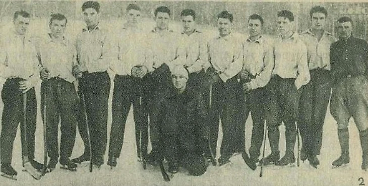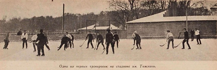 Сезон 1929/30 годов. Хоккеисты физкультурного кружка при стадионе имени М.П. Томского Московского областного отдела Всесоюзного союза рабочих пищевой и вкусовой промышленности СССР (журнал «Физкультура и спорт» № 15 за 15 марта 1930 года)