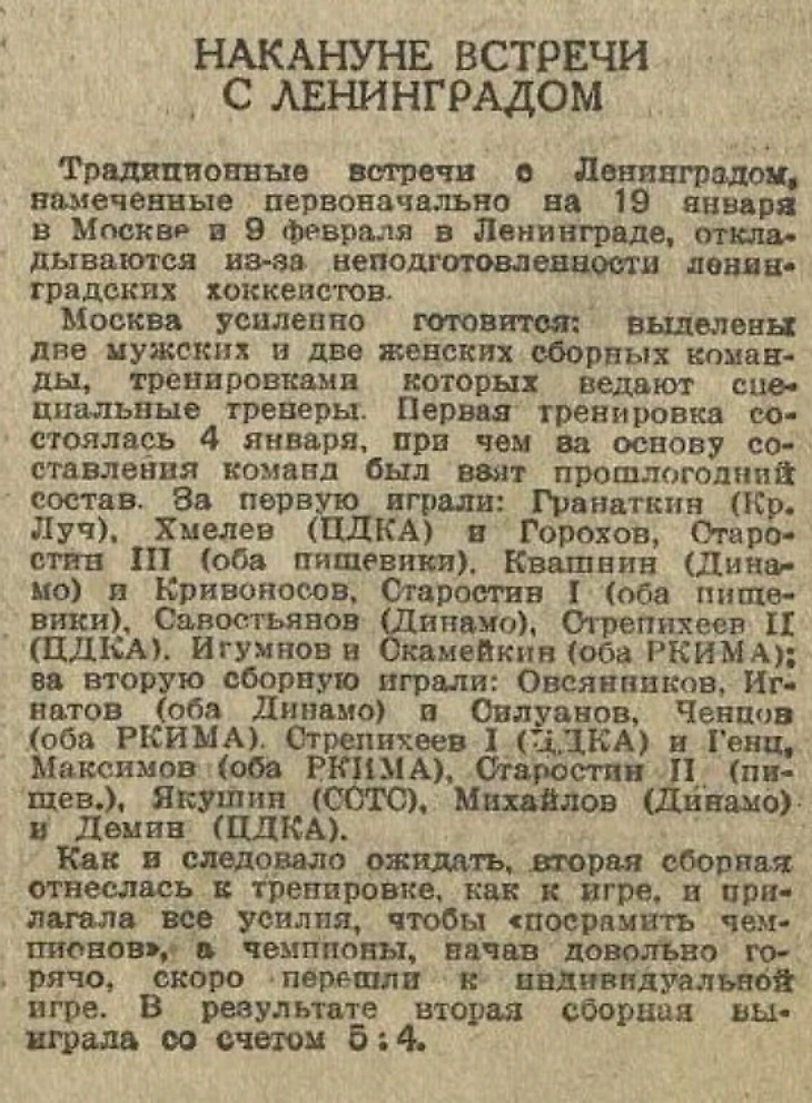 «Традиционные встречи с Ленинградом, намеченные первоначально на 19 января в Москве и 9 февраля в Ленинграде, откладываются из-за неподготовленности ленинградских хоккеистов. Москва усиленно готовится: выделены две мужских в две женских сборных команды, тренировками которых ведают специальные тренеры. Первая тренировка состоялась 4 января, при чем за основу составления команд был взят прошлогодний состав. За первую играли: Гранаткин («Красный луч»); Хмелев (ЦДКА) и Горохов; Старостин III (оба «Пищевик»), Квашнин («Динамо») и Кривоносов; Старостин I (оба «Пищевики»), Савостьянов («Динамо»), Стрепихеев II (ЦДКА), Игумнов и Скамейкин (оба РКимА); за вторую сборную играли: Овсянников; Игнатов (оба «Динамо») и Силуанов; Ченцов (оба РКимА) Стрепихеев I (ЦДКА) и Генц; Максимов (оба РКимА), Старостин II («Пищевики»), Якушин (ССТС), Михайлов («Динамо») и Демин (ЦДКА). Как и следовало ожидать, вторая сборная отнеслась к тренировке, как к игре, и прилагала все усилия, чтобы «посрамить чемпионов», а чемпионы, начав довольно горячо, скоро перешли к индивидуальной игре. В результате вторая сборная выиграла со счетом 5:4» (журнал «Физкультура и спорт» № 4 за 20 января 1930 года).