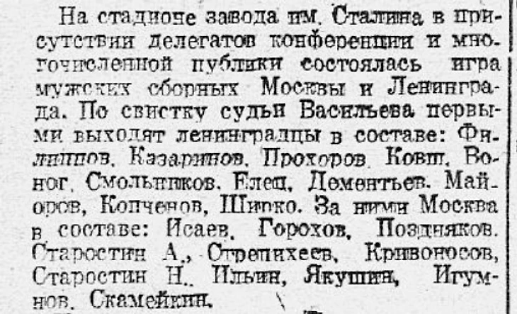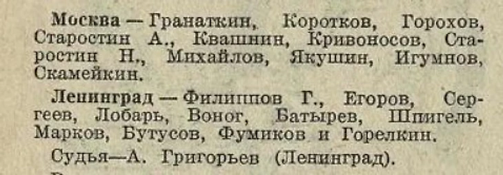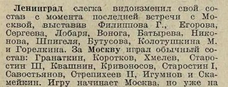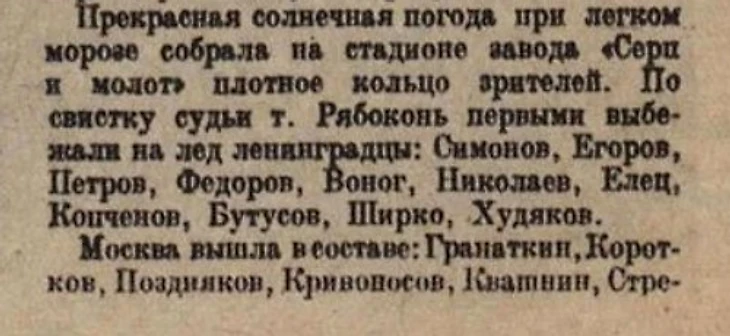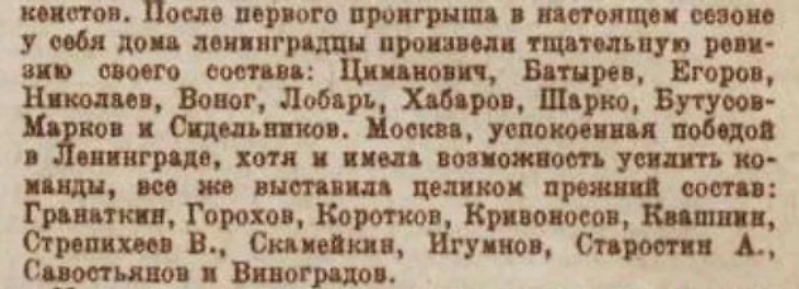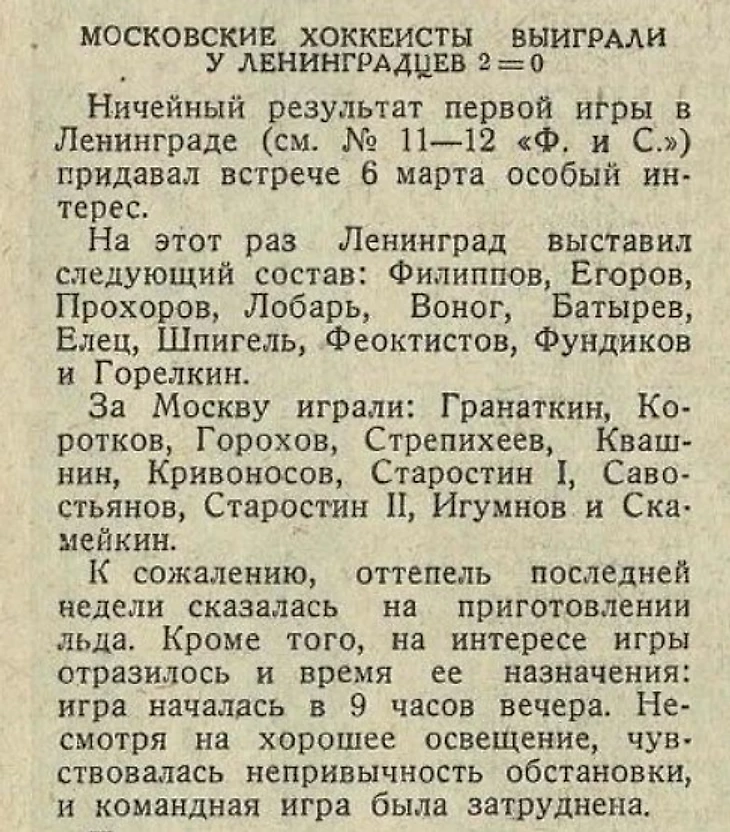 «Еще ни разу за все время существования хоккея московские катки не собирали такого количества зрителей, сколько их пришло 17 февраля на стадион «Динамо» смотреть традиционную встречу Ленинграда с Москвой. Двухнедельное отсутствие игр и результат встречи сборных в Ленинграде (0:0) сделали свое дело, свыше, чем 10 000-я масса, заполнила всю северную и часть южной трибун грандиозного стадиона. <...> Ленинград слегка видоизменил свой состав с момента последней встречи с Москвой, выставив Филиппова Г., Егорова, Сергеева, Лобаря, Вонога, Батырева, Никонова, Шпигеля, Бутусова, Колотушкина М. и Горелкина. За Москву играл обычный состав: Гранаткин, Коротков, Хмелев, Старостин III, Квашнин, Кривоносов, Старостин I, Савостьянов, Стрепихеев II, Игумнов и Скамейкин» (еженедельный журнал «Физкультура и спорт» № 8 за 23 февраля 1929 года).
