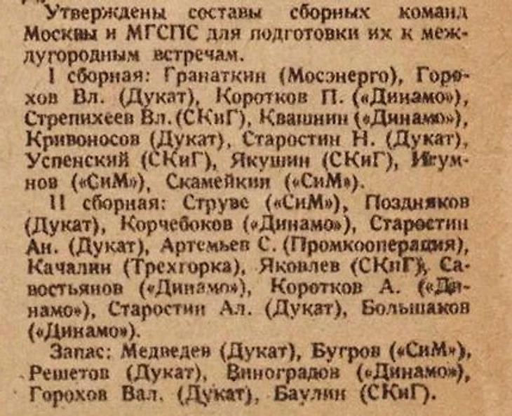 Январь 1933 года. Состав сборных Москвы для междугородних встреч (журнал «Физкультура и спорт» № 1 за январь 1933 года)