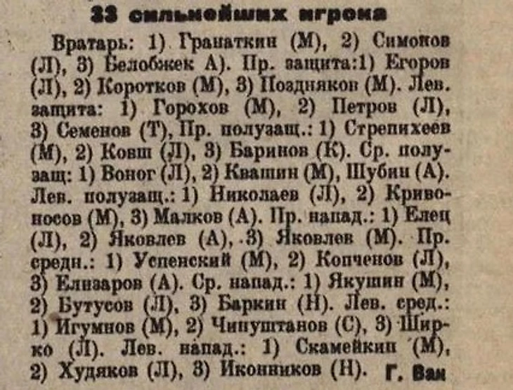 1932 год. 33 сильнейших хоккеиста РСФСР. Вратарь: 1) Гранаткин (Москва), 2) Симонов [Циманович] (Ленинград), 3) Белобжек (Архангельск). Правый защитник: 1) Егоров (Ленинград), 2) Коротков (Москва), 3) Поздняков (Москва). Левый защитник: 1) Горохов (Москва), 2) Петров (Ленинград), 3) Семенов (Тула). Правый полузащитник: 1) Владимир Стрепихеев (Москва), 2) Ковш (Ленинград), 3) Баринов (Калинин). Центральный (средний) полузащитник: 1) Воног (Ленинград), 2) Квашнин (Москва), Шубин (Архангельск). Левый полузащитник: 1) Николаев (Ленинград), 2) Кривоносов (Москва), 3) Малков (Архангельск). Правый крайний нападающий: 1) Елец (Ленинград), 2) Яковлев (Архангельск), 3) Яковлев (Москва). Правый полусредний нападающий: 1) Успенский (Москва), 2) Копченов (Ленинград), 3) Елизаров (Архангельск). Центральный (средний) нападающий: 1) Якушин (Москва), 2) Бутусов (Ленинград), 3) Баркин (Нижний Новгород). Левый полусредний нападающий: 1) Игумнов (Москва), 2) Чинуштанов (Свердловск), 3) Ширко (Ленинград). Левый крайний нападающий: 1) Скамейкин (Москва), 2) Худяков (Ленинград), 3) Иконников (Нижний Новгород). Журнал «Физкультура и спорт» № 9 за март 1932 года