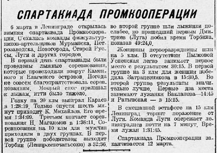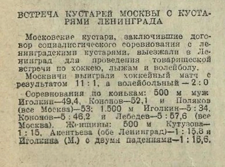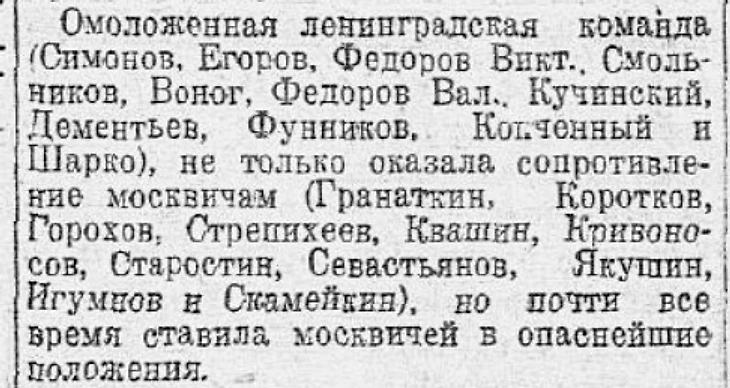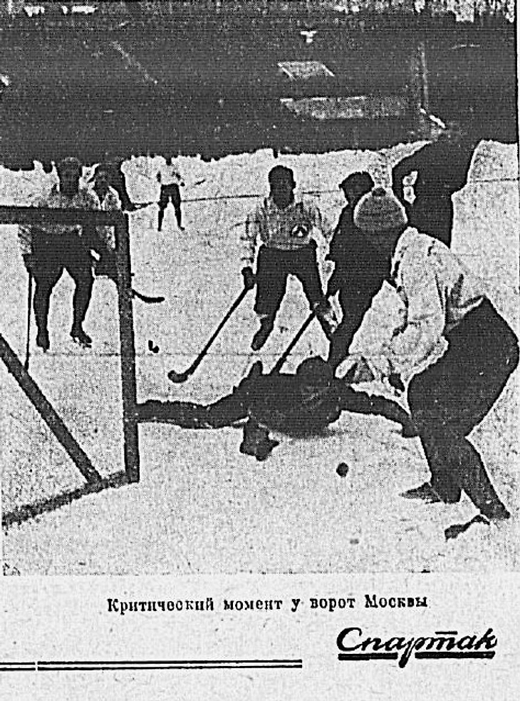 «Конькобежцев сменили сборные хоккейные команды Москвы и Ленинграда. К сожалению, вновь омоложенная команда последнего оказалась совершенно несыгранной между собой и не смогла оказать должного сопротивления москвичам. Первая половина прошла довольно оживленно и игра велась преимущественно от полузащиты до полузащиты. Мало пришлось поработать вратарям. Первый мяч забивает Москва, вскоре затем ленинградцы сквитывают его, но на двадцатой минуте ленинградскому вратарю приходится снова вытащить мяч из своих ворот. Со счетом 2:1 в пользу Москвы закончилась первая половина игры. После перерыва ленинградцы совсем завяли. Вратарь стал пропускать мячи чуть ли не с середины поля и в результате игра заканчивается небывалым сильным поражением Ленинграда 6:2» (физкультурный журнал «Спартак» Ленинградского областного совета физкультуры № 16 за 20 марта 1931 года).