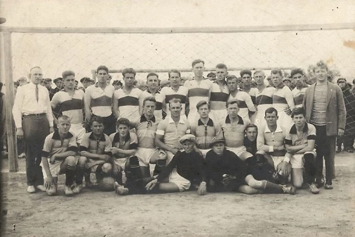 1930-е (?) годы. Футбольная команда табачной фабрики «Дукат» (?). Николай Старостин