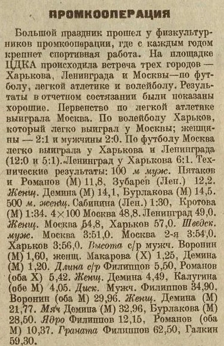 *** - «В прошлом, как говорится, у пищевиков «работишка» спортивная была поставлена «на ять»... Налицо была и узкая спортизация, и куча зачемпионившихся ребят, и прочие «смертные грехи» прошлого этапа работы по ф. к. Даже среда руководящих организаций союз пищевиков слыл за «кузницу чемпионства»... (журнал «Физкультура и спорт» № 20 за 10 апреля 1930 года)