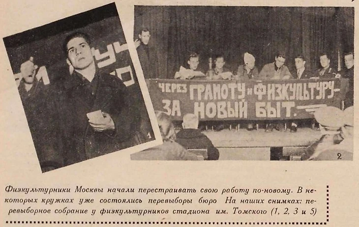 Ноябрь 1929 года. Клуб фабрики «Дукат» (1-я Тверская-Ямская, 46). Перевыборное собрание в физкультурном кружке при стадионе им. М.П. Томского Московского губернского отдела Всесоюзного союза рабочих пищевой и вкусовой промышленности СССР. Николай Старостин (третий справа) к карьере спортивного функционера стал готовиться, еще будучи действующим спортсменом (еженедельный журнал «Физкультура и спорт» № 48 за 30 ноября 1929 года)