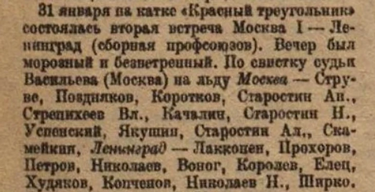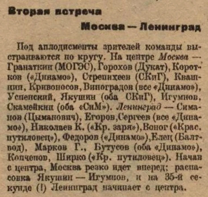 «10 тысяч зрителей наполнили трибуны стадиона им. Ленина в день традиционной встречи первых хоккейных сборных Москвы и Ленинграда. В публике понятное волнение, вызываемое исключительным интересом к игре. В прошлом году Ленинград выиграл в серьезной борьбе, с незначительным преимуществом - 4:3. За последние годы Москва, вообще, значительно повысила класс игры, достигнув этого длительной тренировкой и верной комбинацией составов своих сборных команд. Из года в год шло выравнивание отдельных линий команды, на каждое место выдвигался игрок, технически подготовленный и способный к командной игре. За последние годы в рядах московской сборной появилось немало молодых игроков, ленинградцы же вели более консервативную политику, ориентируясь на старых, давно зарекомендовавших себя хоккеистов. В отчетной игре за Москву играли Гранаткин, Хмелев, Коротков, Старостин Андр., Квашнин, Кривоносов, Старостин Н., Савостьянов, Стрепихеев Е., Игумнов и Скамейкин. Состав ленинградской команды: Евдокимов, Полежаев, Егоров, Гуськов, Воног, Батырев, Иванов, Шпигель, Бутусов, Колотушкин и Горелкин. Из прошлогоднего состава отсутствовали лишь Г. Филиппов, повредивший себе ногу за два дня до встречи, и П. Филиппов, находящийся в переходном «карантине». <...> Прочие ленинградские передовые были крепко зажаты Квашниным, Старостиным А[ндр]. и Коротковым, показавшим себя в отчетной игре сильнее Хмелева. <...> Игра, таким образом, закончилась ничего неговорящим счетом 0:0. Отсутствие результата следует объяснить сильной игрой защитных линий обеих команд, и весьма неактивным ведением игры передовыми противников. Общее впечатление было все же выгодным для Москвы, команда которой представляет собой более спаянный коллектив» (еженедельный журнал «Физкультура и спорт» № 5 за 2 февраля 1929 года).
