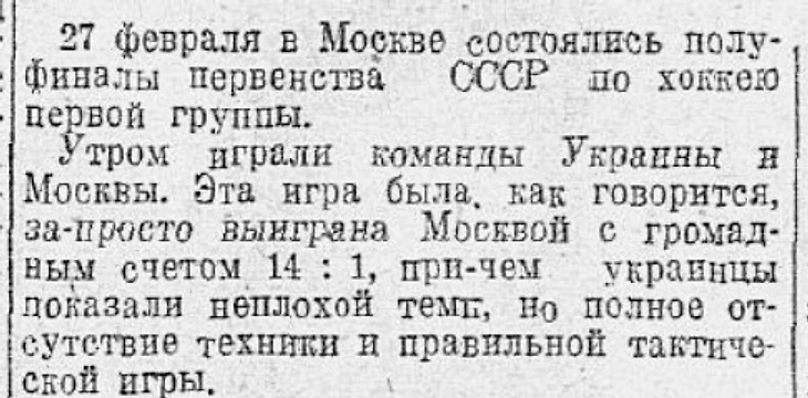 27 февраля 1933 года. Москва. Первенство СССР. Полуфинал. Москва - Украинская ССР - 14:1 (газета «Спартак» орган Ленинградского областного совета физкультуры № 11 за 8 марта 1933 года)