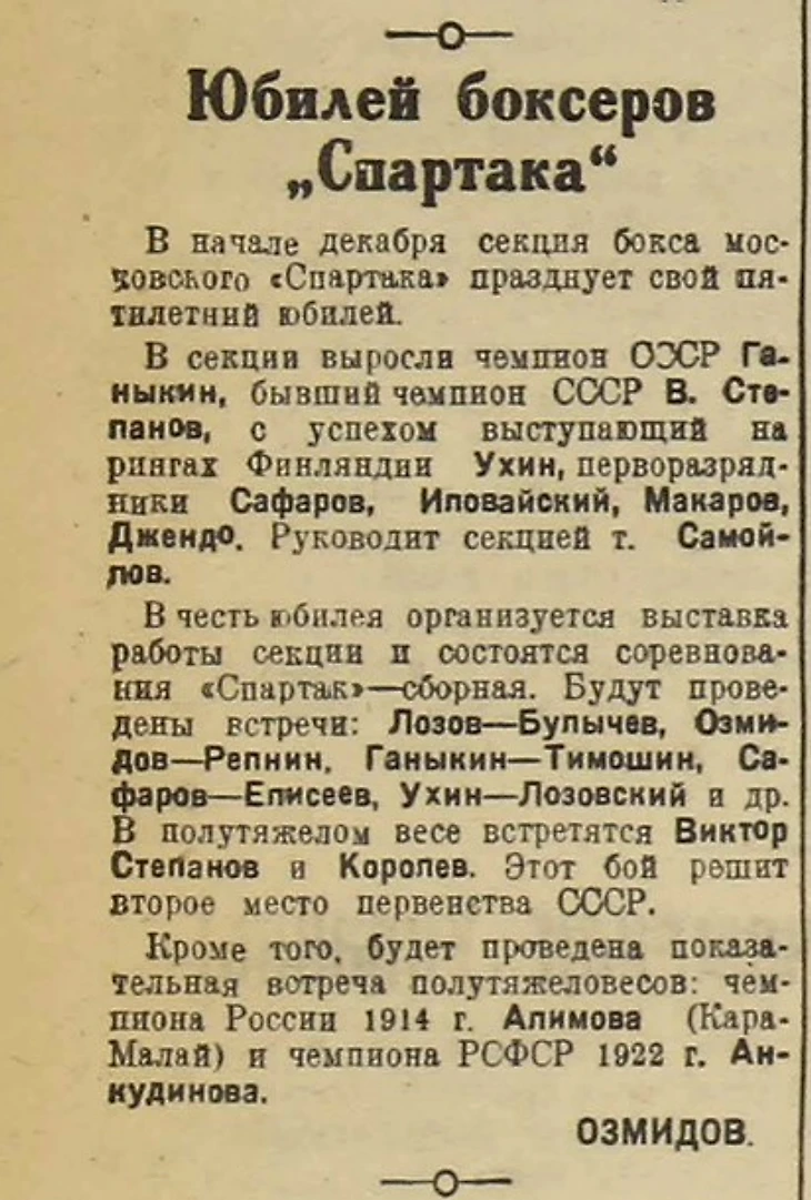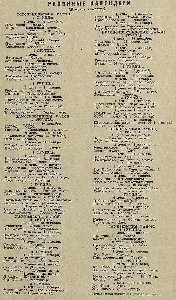 «Календарь на первенство Москвы проходит с перебоями. Пятый календарный день наполовину сорван в виду поездки москвичей в Ленинград, а шестой день перенесен в виду праздника на стадионе «Динамо» (журнал «Спартак» орган Ленинградского областного совета физкультуры № 7-8 за 18 февраля 1932 года)