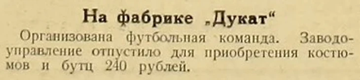 Весна-лето 1924 года. Создание футбольной команды при табачной фабрике «Дукат» (газета «Красный спорт» № 2 за 27 июля 1924 года)