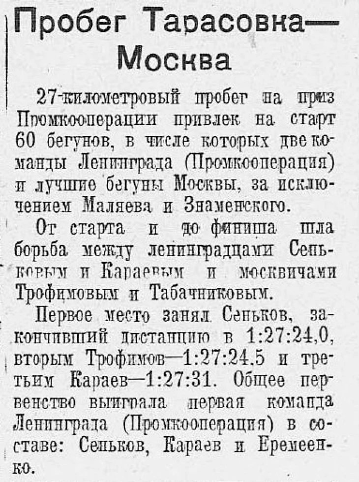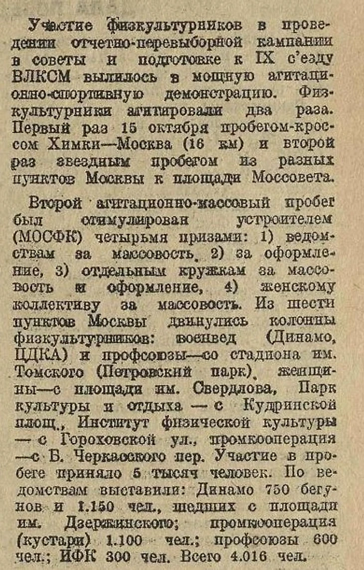 «Игры на первенство Москвы почти закончились. В финал вышли, как и следовало ожидать, «Динамо» и ССТС, две наиболее сильные организации. Представляет интерес игра из-за 3-4 места между «Серпом и молотом» и «Трехгоркой». Следует указать, что перегруппировка сил в связи с перестройкой по производственному принципу больно ударила в начале ceзонa по техническим достижениям команд. Но под конец календарей снова появились цельные коллективы с хорошей техникой и тактикой, - по-видимому перестройка вполне совместима с техническим ростом» (физкультурный журнал «Спартак» Ленинградского областного совета физкультуры № 13 за 5 марта 1931 года).
