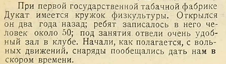 1922 год. Открытие кружка физкультуры при табачной фабрике «Дукат» (журнал «Красный спорт» № 11-12 за июнь 1924 года)