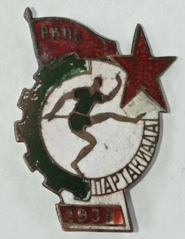 Единый всесоюзный значок физкультуры, утвержденный ВСФК и разрешенный Главлитом (удостоверение № 2101 от 8 июля 1925 года). Изготовлялся из металла под серебро с темной оксидировкой и красной эмалью на стяге (журнал «Известия физической культуры № 20 за октябрь1925 года)