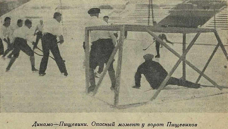 «Четвертый день хоккейного календаря. «Пищевики» бьют «Динамо» - 2:0. <...> Весь интерес календарного дня сосредоточился на игре первых команд «Динамо» и «Пищевиков». Как той, так и другой команде необходимо было реабилитировать себя: «Динамо» за ничью с СТС, а «Пищевикам» за проигрыш РКИМА. Трибуна динамовского стадиона вместила большое количество зрителей, которые смогли, наконец, наблюдать игру в приличных условиях. В обеих командах некоторые изменения в составах, У «Динамо» на левом краю Большаков, у «Пищевиков» очередная перестановка, на этот раз наиболее удачная. В центре полузащиты Кривоносов, левым полузащитником Решетов, Горохов I в центре нападения. Игра начинается энергичным нападением «Динамо», уже на 2 минуте создающем опасное положение у ворот «Пищевиков». Минутная растерянность «Пищевиков» сменяется энергичным натиском, и уже на 4 минуте хорошо прорывающийся Горохов I заставляет Овсянникова взять трудный мяч. Нападение ведут преимущественно «Пищевики». У «Динамо» игра не ладится. На 9 минуте Горохов, подойдя вплотную к воротам, забивает первый мяч. У «Динамо» чувствуется растерянность. Полузащита играет кучей, мешая своему нападению, игроки которого не держат мест. Бесцветен Квашнин, заметно уступающий отлично играющему Кривоносову. Стремление отыграться, с одной стороны, и желание не упустить возможную победу, приводят к резкости, хорошо сдерживаемой судьей В. Стрепихеевым. Постепенно преимущество «Пищевиков» слабеет, и на 20-х минутах игра делается более ровной. В игре «Динамо» чувствуется какая-то вялость, в то время как «Пищевики» играют с большим воодушевлением. Переменная игра создает ряд интересных опасных моментов у обоих ворот, что дает возможность обоим вратарям Овсянникову и Егорову эффектно отразить несколько трудных мячей. На 41 минуте мяч вторично в воротах «Динамо». Кривоносов бьет свободный удар, мяч попадает к Горохову, который в свою очередь передает его незакрытому Исакову, забивающему мяч в ворота. К перерыву счет 2:0. Во второй половине игры нападают снова «Пищевики», но уже без той энергии. На 8 минуте в ворота «Динамо» следует ряд угловых ударов; Овсянников снова показывает неплохую игру. Редкие попытки «Динамо» пробить по воротам ликвидируются игрой зашиты «Пищевиков». Снегопад приводит к тому, что мяч перестает катиться по льду, задерживаемый снегом. Игра теряет интерес. Нападение «Динамо», игравшее и без того плохо, окончательно теряется, ломая свою линию и портя друг другу игру. В середине второй половины у «Динамо» начинает чувствоваться некоторое оживление: более удачно играет Квашнин, и героические усилия прикладывает Коротков. «Пищевики» переходят к обороне, чем не дают возможности изменить «сухой» счет в свою пользу» (еженедельный журнал «Физкультура и спорт» № 3 за 19 января 1929 года).