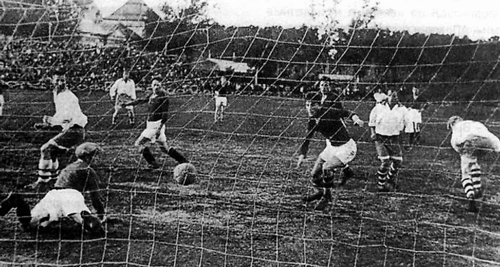 17 февраля 1929 года. Москва. Стадион «Динамо». 10 000 зрителей. Москва - Ленинград - 1:2 (1:1). «У ворот Ленинграда. Филиппов за работой». Николай Старостин (крайний слева) атакует ворота гостей (еженедельный журнал «Физкультура и спорт» № 8 за 23 февраля 1929 года)