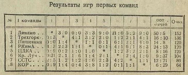 *** *** - Игра СКиГ - «Динамо» завершилась вничью 0:0. Во всех остальных матчах и СКиГ, и «Динамо» выиграли. Дополнительный был отменен из-за оттепели. Победителями первенства объявили обе команды. «Промкооперация» завершила турнир на четвертом месте