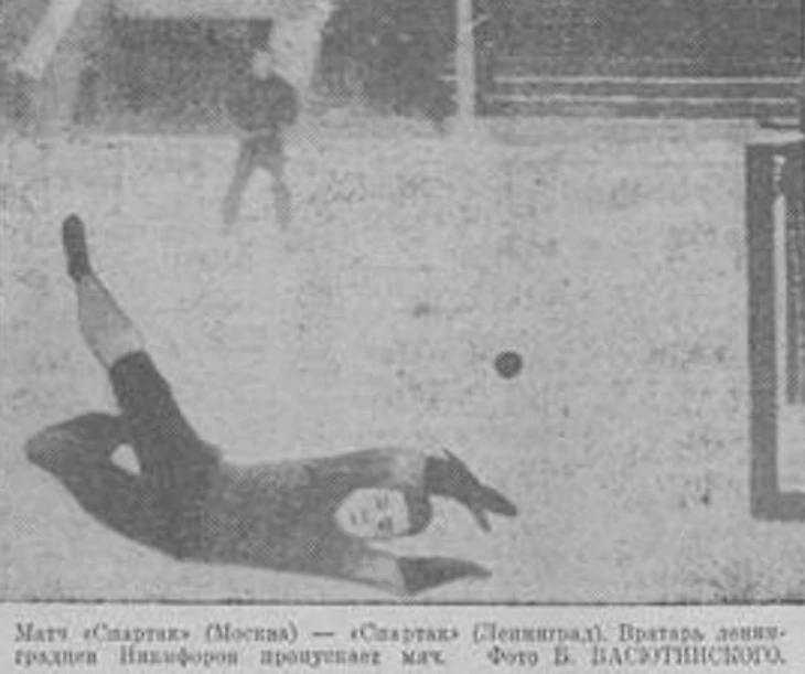 14 февраля 1938 года. Ленинград. Стадион им. В.И. Ленина. Кубок СССР. 1/8 финала. «Спартак» (Ленинград) - «Спартак» (Москва) - 0:2 (0:2). «Вратарь ленинградцев Никифоров пропускает мяч» (фото Б. Васютинского из городской и областной физкультурной газеты «Спартак» (Ленинград) № 15 за 15 февраля 1938 года)