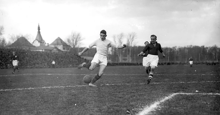 27 октября 1929 года. Москва. Стадион им. Томского. Сборная Москвы - сборная Дании ASF - 6:1. Николай Старостин (с мячом)