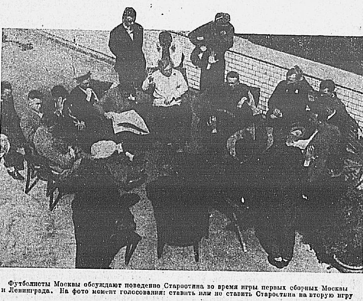 22 июня 1930 года. Ленинград. Собрание сборной Москвы после матча со сборной Ленинграда, состоявшегося 21 июня 1930 года на стадионе имени В.И. Ленина - 3:3 (3:0), в котором «за повторную демонстративную выходку по адресу судьи» был удален «центр московской полузащиты А. Старостин». «Футболисты Москвы обсуждают поведение [Андрея] Старостина во время игры первых сборных Москвы и Ленинграда. На фото момент голосования: ставить или не ставить Старостина на вторую игру» (из физкультурного журнала Ленинградского областного совета физкультуры «Спартак» № 27 за 30 июня 1930 года). По результатам собрания Андрей Старостин 22 июня 1930 года выйдет в стартовом составе на матч со второй сборной Ленинграда (2:3) в амплуа центрального полузащитника и будет заменен в перерыве