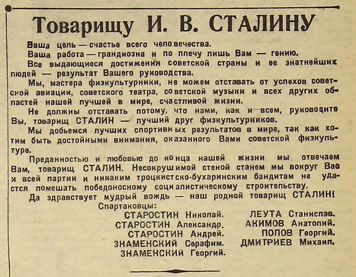 Братья Старостины: «Да здравствует мудрый вождь» (газета «Красный спорт» № 103 за 27 июля 1937 года)