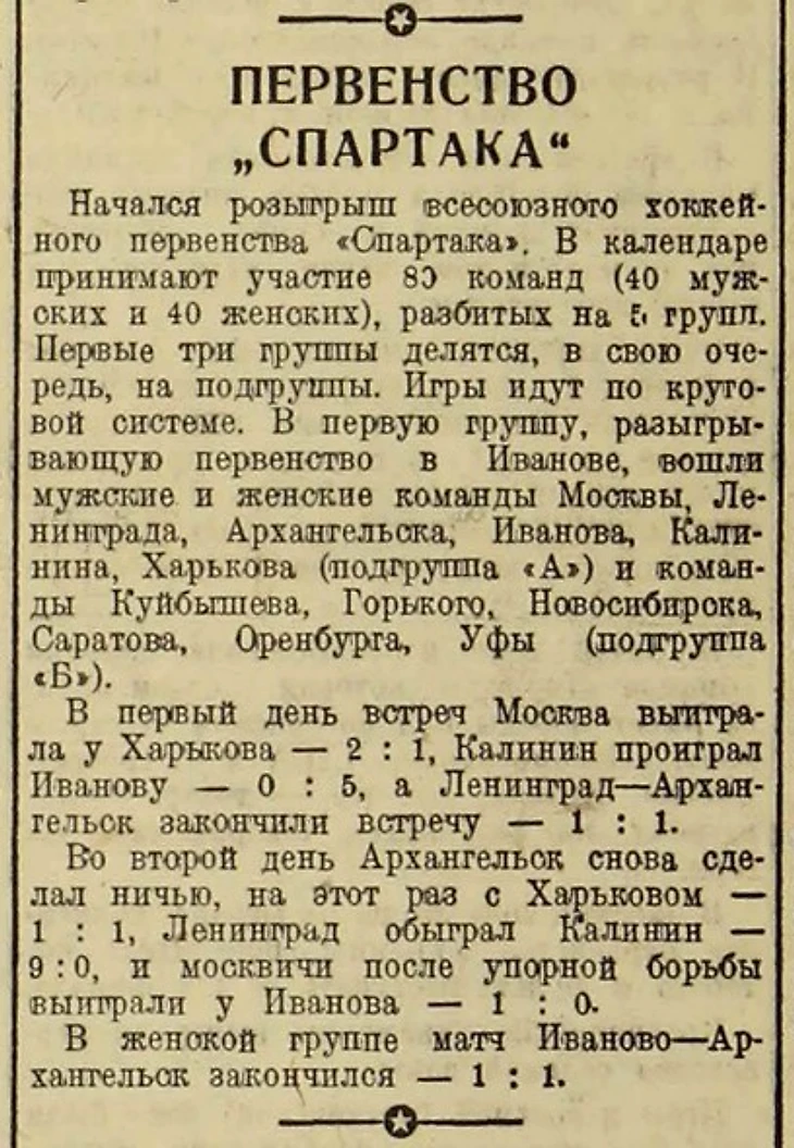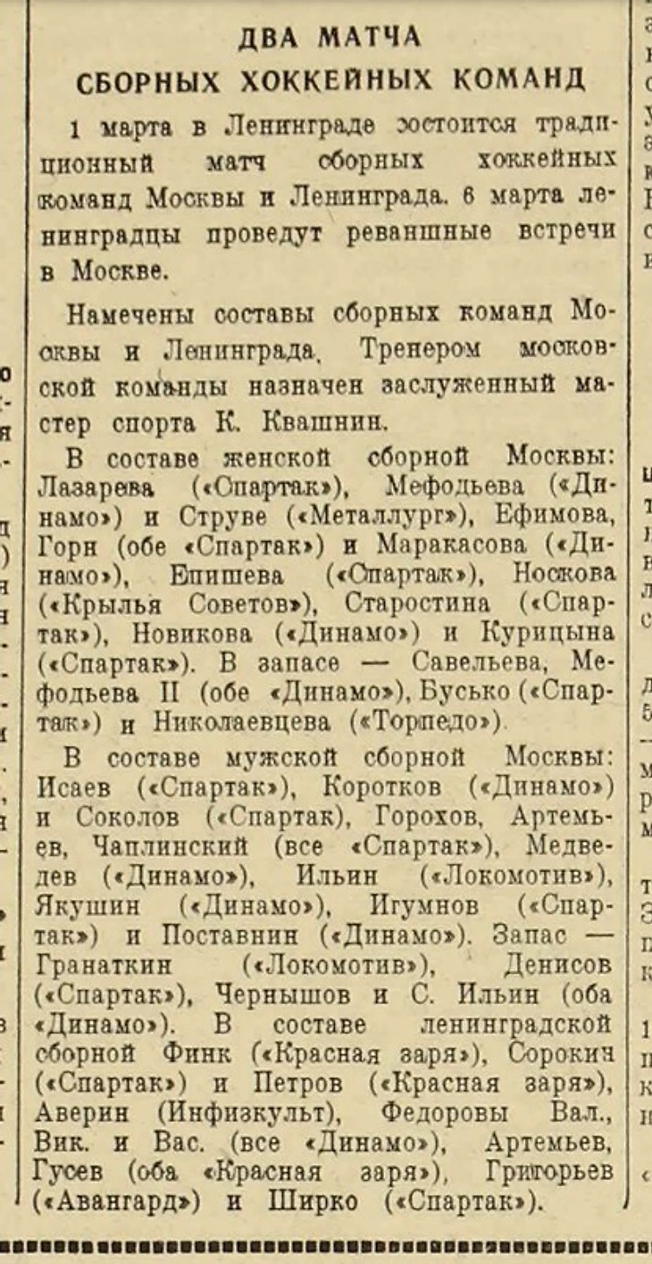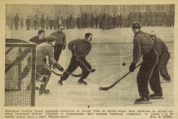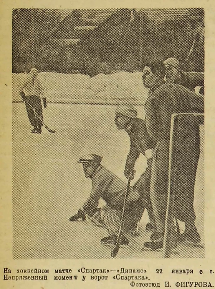 «Завтра на стадионе «Локомотива» состоится интереснейший матч сезона. Во втором круге первенства Москвы по хоккею встречаются лидеры календаря - «Динамо» и «Спартак». Клубы играют первой и второй мужскими командами» (газета «Красный спорт» № 25 за 19 февраля 1938 года).