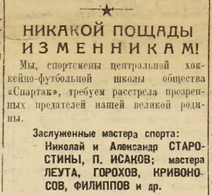 Николай и Александр Старостины: «Никакой пощады изменникам!» (газета «Красный спорт» № 14 за 27 января 1937 года)