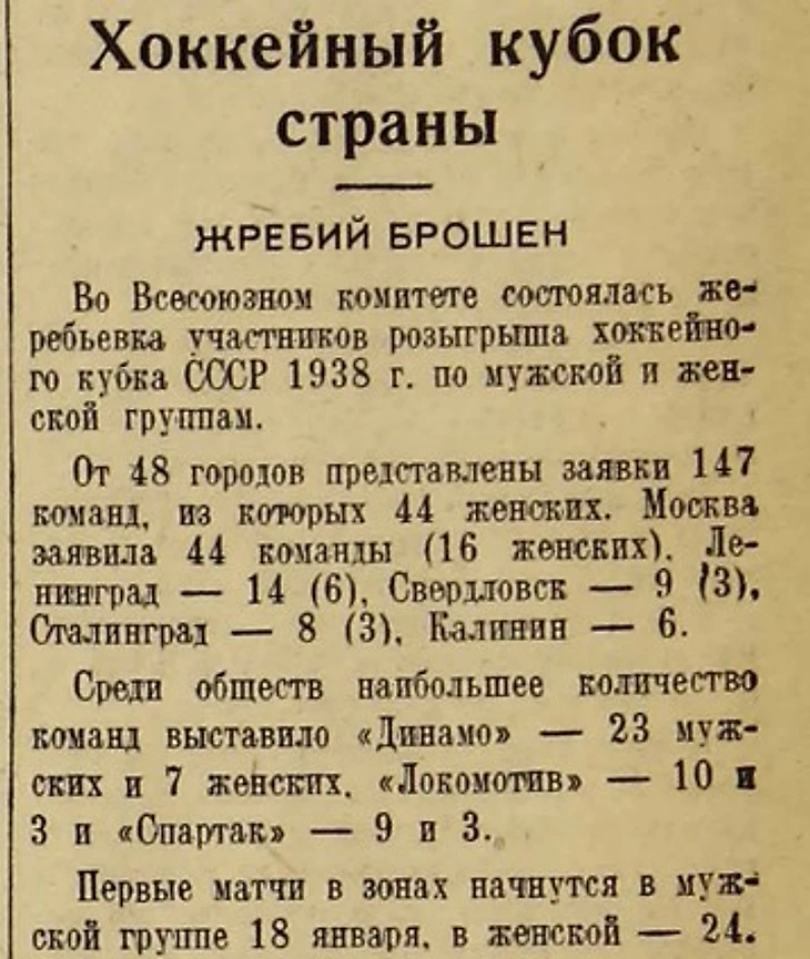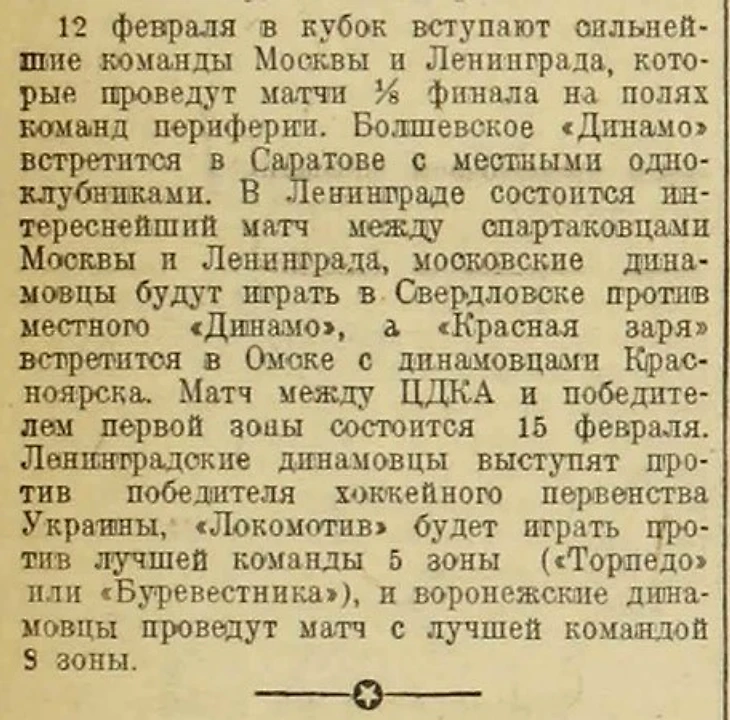 «18 февраля состоятся четвертьфинальные матчи мужской группы кубка СССР по хоккею. Встречаются «Спартак» (Москва») - «Динамо» (Болшево), «Красная Роза» (Москва) - «Динамо» (Москва), «Динамо» (Ленинград) - «Локомотив» (Москва) и победитель пары ГОЛИФК - ЦДКА играет против победителя пары «Красная заря» - красноярское «Динамо» (газета «Красный спорт» № 21 за 11 февраля 1938 года).