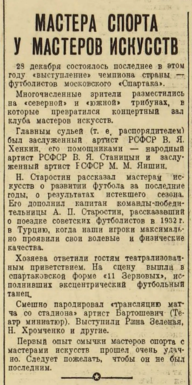 «Первый опыт смычки мастеров спорта с мастерами искусств». Андрей и Николай Старостины в концертном зале КМИ (газета «Красный спорт» № 1 за 1 января 1939 года)