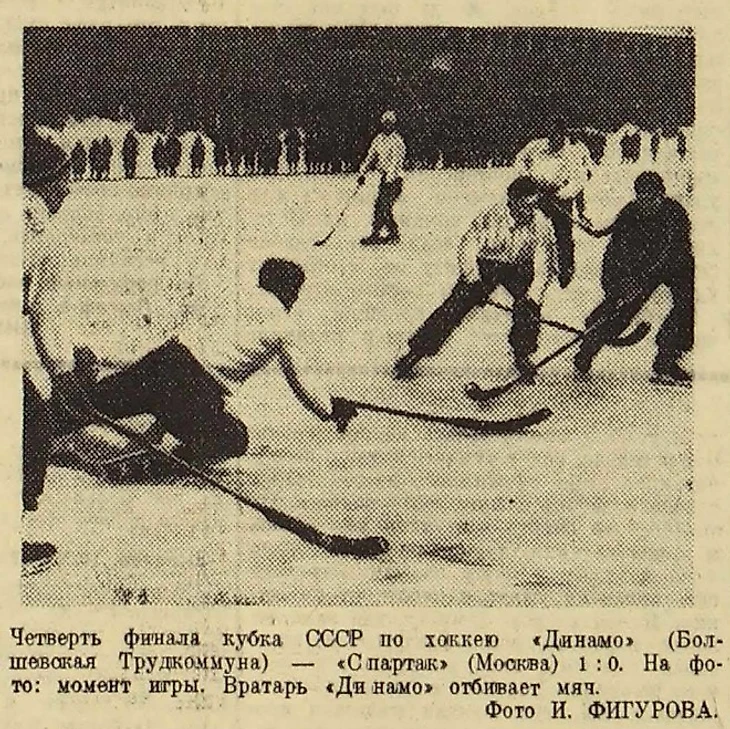 «Хоккейный матч на кубок СССР команд мастеров ленинградского и московского «Спартака» собрал на стадионе имени Ленина большое количество зрителей. Все были уверены в победе одной из сильнейших команд Москвы и СССР. Интересовал лишь счет и ход игры. Проставленные москвичи продемонстрировали самую заурядную игру. Движение к воротам противника, движение «лавой», без хорошо задуманных комбинаций, - вот что преподнесла зрителям команда, претендующая на звание сильнейшей в Советском Союзе. Не лучше играли и ленинградцы. Временами было просто скучно. Игра сложилась так: рослые, физически сильные москвичи «задавили» ленинградцев своим «авторитетом». Зрители были свидетелями полной и ничем не оправдываемой растерянности хозяев поля, но и у тех, кто вел игру, ничего, кроме быстроты и уверенности и победе, зрители не наблюдали. 15-я минута на исходе. Москвичи проводят очередную атаку. Лучший игрок нападения московской команды левый инсайд Игумнов сильно бьет под штангу. Удар «мертвый» и вратарь Никифоров вынимает из ворот первый мяч. Затем паника в команде Ленинграда заметно ослабевает, и ленинградцы имеют возможность несколько раз сквитать счет. По поочередно мажут Иванов, Бизюков. На 41-й минуте судья Гольдберг назначает в пользу Москвы штрафной удар. Москвичи его используют, мяч, касаясь одного из игроков, вторично посещает ворота ленинградцев. Вторая половина матча прошла при заметном превосходстве москвичей. Однако, стойко защищавшиеся ленинградцы не дали противнику возможности увеличить результат. Счет 2:0 в пользу Москвы. Финальный свисток, и первая из ленинградских команд закончила свой путь в розыгрыше хоккейного кубка СССР» (городская и областная физкультурная газета «Спартак» (Ленинград) № 15 за 15 февраля 1938 года).