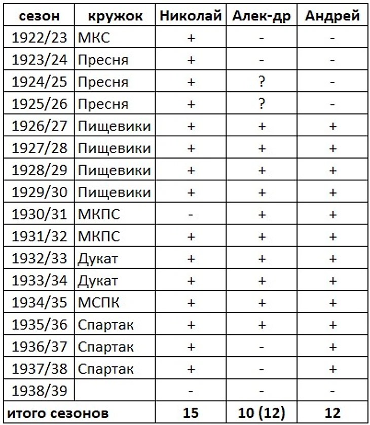 На этом пора завершать затянувшийся экскурс в хоккейные карьеры братьев Старостиных, поигравших во множестве московских команд - выступали они за клуб, созданный по инициативе учеников ремесленного училища при текстильной фабрики, за клуб организованный при районном комитете комсомола, за кружок при доме культуры губернского отдела союза пищевиков, за клуб при городском совете кустарей-артельщиков, за клуб табачной фабрики и закончили карьеру в обществе кооператоров-промысловиков. Несмотря на такое обилие команд, братья, если не считать начало карьеры Николая, выступали в клубах за спинами, которых стояло всего два лишь крепких московских хозяйственника - Николай Тихонович Пашенцев (комсомольская «Пресня», губернские «Пищевики», табачный «Дукат») и глава московской промысловой кооперации кустарей Иван Епифанович Павлов (МКПС, МСПК, «Спартак»).
