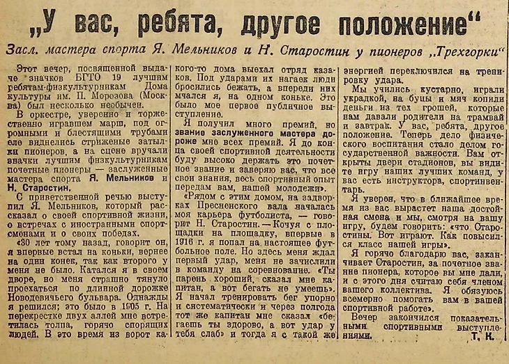 Николай Старостин в гостях у пионеров «Трехгорки» (газета «Красный спорт» № 65 за 25 ноября 1934 года)