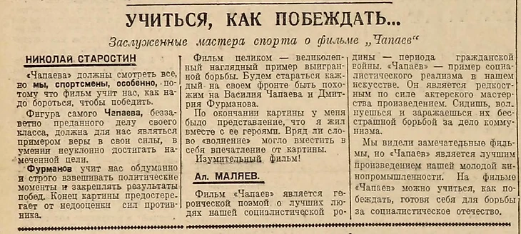Николай Старостин о фильме «Чапаев» (газета «Красный спорт» № 66 за 30 ноября 1934 года)
