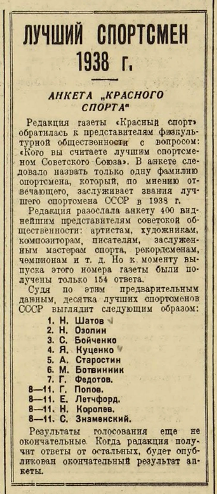 1938 год. Андрей Старостин в десятке лучших спортсменов СССР (газета «Красный спорт» № 1 за 1 января 1939 года)