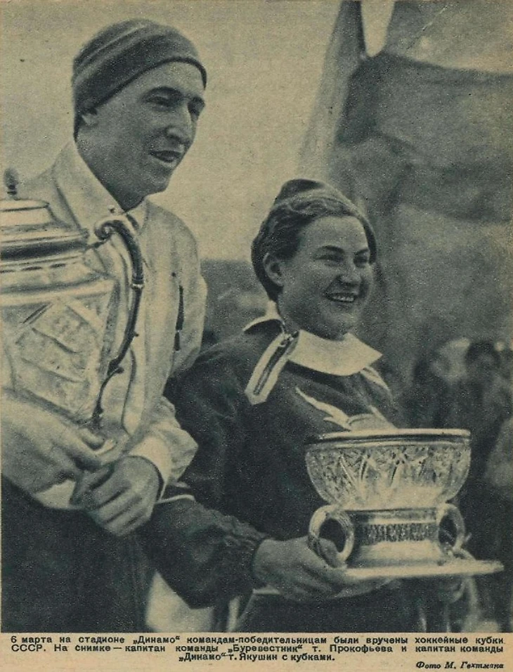 «Игрой между сборными командами Москвы и Ленинграда закончился хоккейный сезон 1938 года. Перед началом игры состоялся торжественный парад всех московских команд, участвовавших в розыгрыше хоккейного «Кубка СССР». После парада с приветственной речью к хоккеистам обратился председатель Всесоюзного комитета по делам физкультуры и спорта т. Зеликов. Затем капитанам команд-победительниц кубка 1938 года Вере Прокофьевой («Буревестник») и Михаилу Якушину («Динамо») были вручены хрустальные кубки. Первыми на поле встретились женские сборные команды. Смелая и напористая игра нападения москвичек дала им возможность без особого труда выиграть встречу со счетом 3:0. Сложнее проходила игра между мужскими командами. Силы противников были равными. К концу первого тайма счет был 2:0 в пользу москвичей. Явный перевес оказался на их стороне, и только почти на последней минуте второго тайма ленинградцы отквитали один мяч» (газета «Красный спорт» № 33 за 7 марта 1938 года).