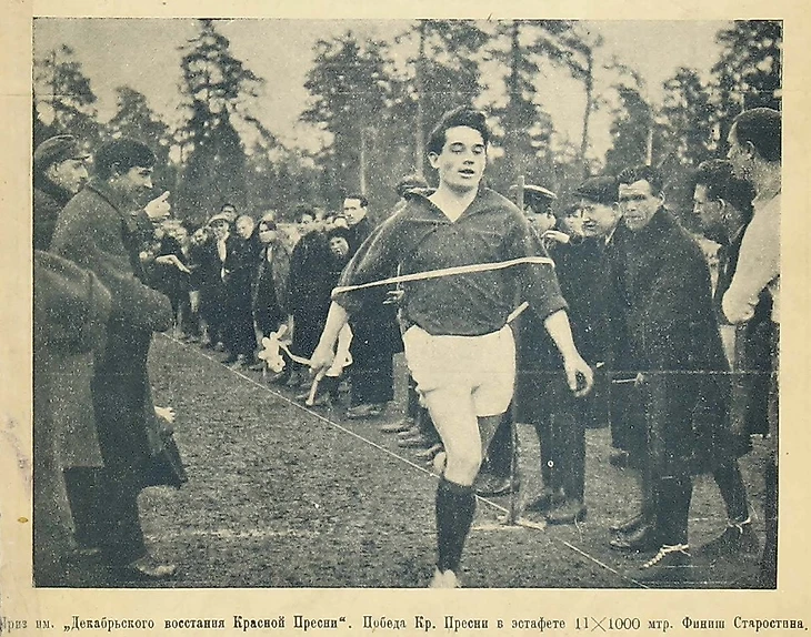 28 апреля 1924 года. Сокольники. Стадион ОППВ. Финиш Николая Старостина в эстафете 11 х 1 000 м (журнал «Красный спорт» № 10 за май 1924 года)