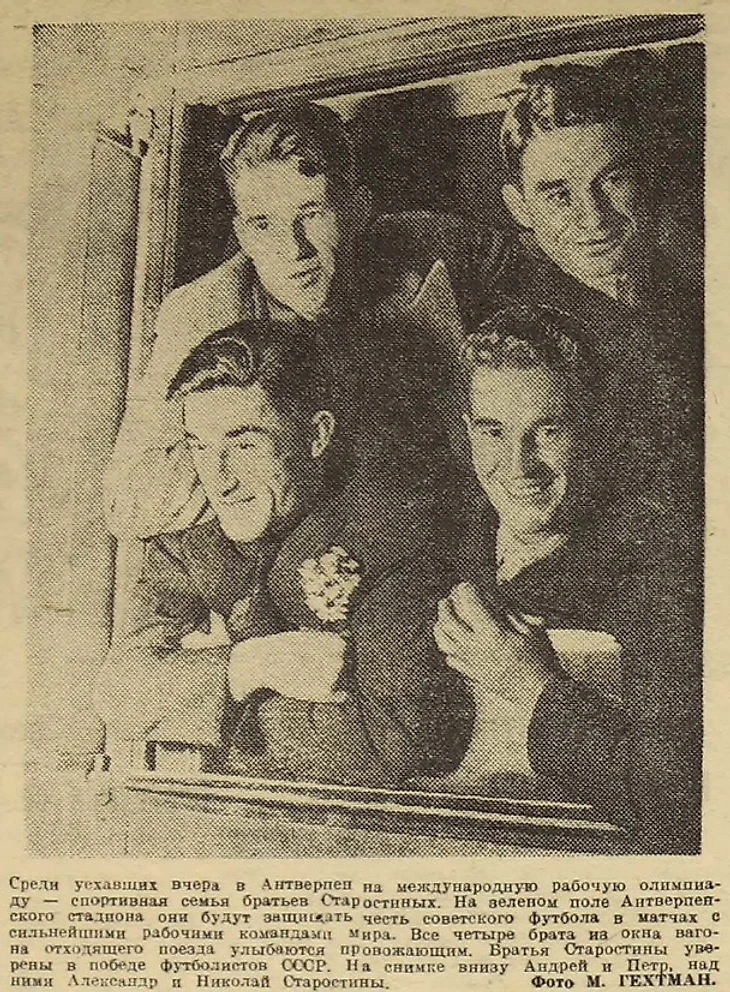 26 июля 1937 года. Москва. Белорусский вокзал. Братья Старостины в вагоне поезда, отправляющемся на III Рабочие Олимпийские игры (фото М. Гехтмана)
