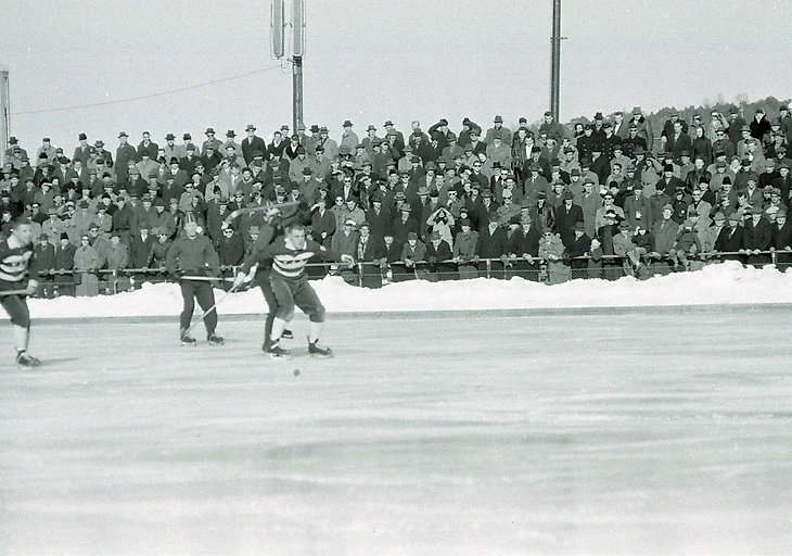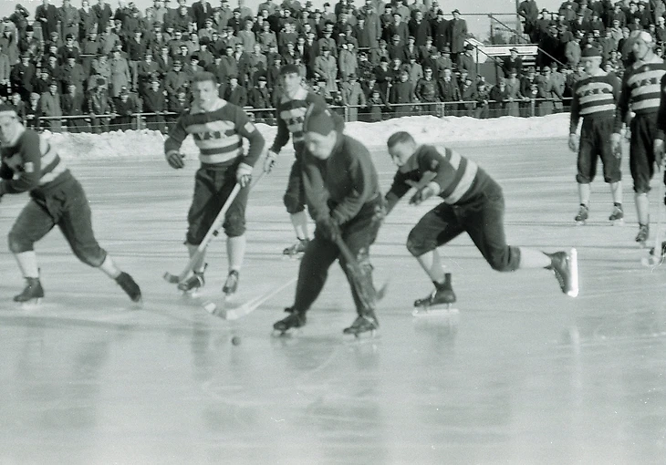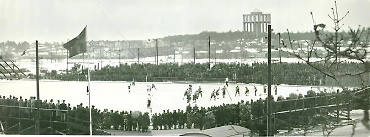 23 марта 1958 года. Швеция. Вестерос. Стадион «Роклунда» (искусственный лед). 1 588 зрителей. СК «Вестерос» (Вестерос) - СКВО (Свердловск) - 4:6 (1:2). Капитан правый полусредний Валентин Атаманычев (на дальнем плане в центре). Фотограф Оке Ларссон (Åke Larsson) / digitaltmuseum.se