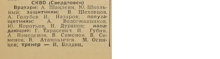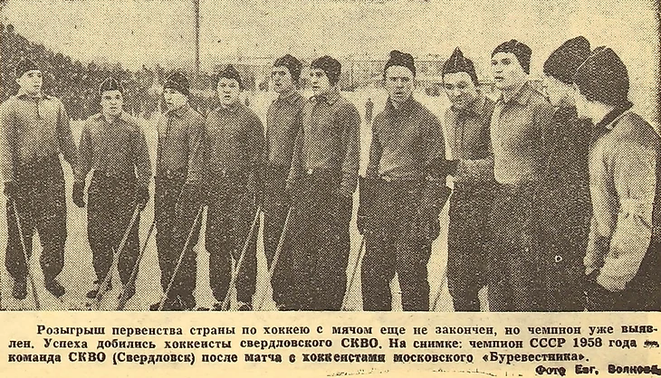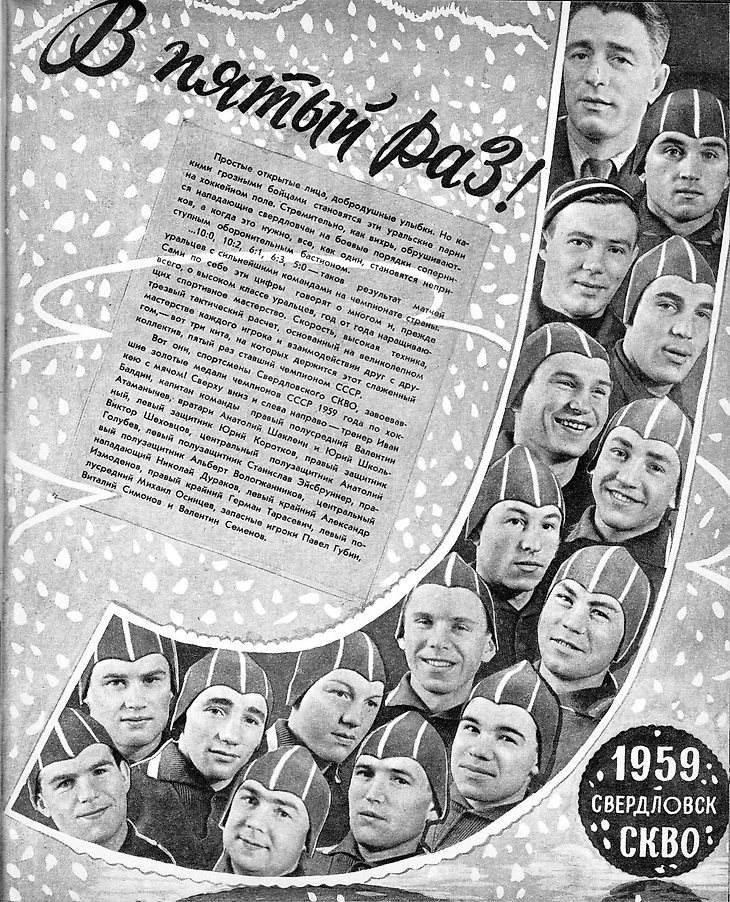 Сезон 1958/59 годов. Свердловский СКВО - пятикратный чемпион СССР (сверху вниз и слева направо): тренер Иван Балдин, капитан команды правый полусредний нападающий Валентин Атаманычев, вратари Анатолий Шаклеин и Юрий Школьный, левый защитник Юрий Коротков, правый защитник Виктор Шеховцов, центральный полузащитник Анатолий Голубев, левый полузащитник Станислав Эйсбруннер, правый полузащитник Альберт Вологжанников, центральный нападающий Николай Дураков, левый крайний нападающий Александр Измоденов, правый крайний нападающий Герман Тарасевич, левый полусредний нападающий Михаил Осинцев, запасные игроки нападения: Павел Губин, Виталий Симонов и Валентин Семенов (журнал «Спортивные игры» № 3 за март 1959 года)