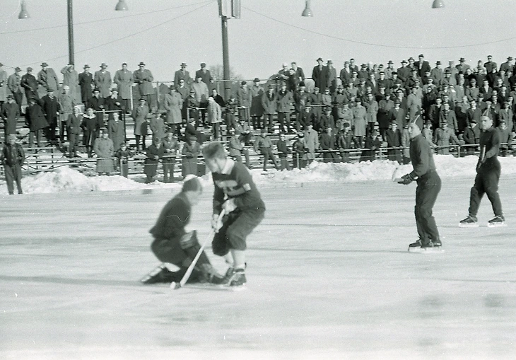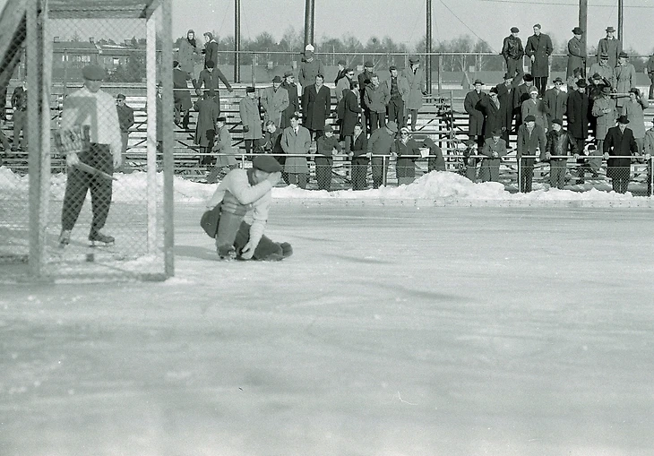 23 марта 1958 года. Швеция. Вестерос. Стадион «Роклунда» (искусственный лед). 1 588 зрителей. СК «Вестерос» (Вестерос) - СКВО (Свердловск) - 4:6 (1:2). Вратарь Юрий Школьный. Фотограф Оке Ларссон (Åke Larsson) / digitaltmuseum.se