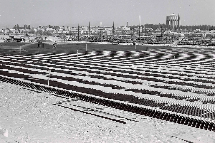 Ноябрь 1956 года. Швеция. Вестерос. Роклунда. Заливка первого в Швеции катка с искусственным льдом для хоккея с мячом. Фотограф Бертиль Форсен (Bertil Forsén) / digitaltmuseum.se