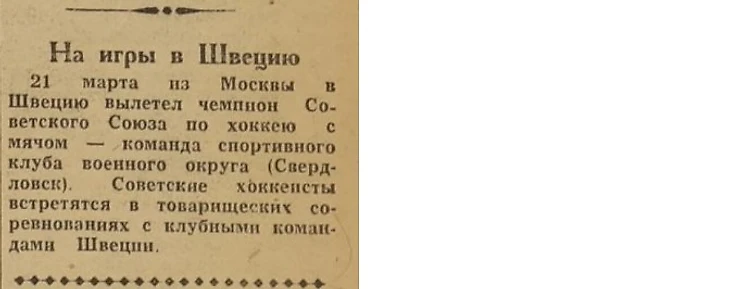 «Советский спорт» (№ 69 от 22 марта 1958 года) о начале шведского турне хоккеистов свердловского СКВО