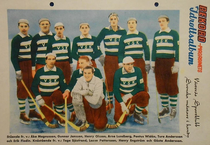 Февраль 1950 года. СК «Вестерос» (Västerås Sportklubb / VSK) - победитель чемпионата Швеции по хоккею с мячом 1949/50 годов - нижний ряд (справа налево): Таге Шестранд/Tage Sjöstrand, Ларс Петерссон/Lasse Pettersson, Генри Энгстрём/Henry Engström и Йёста Андерссон/Gösta Andersson; верхний ряд (справа налево): Оке Магнуссон/Åke Magnusson, Гуннар Янссон/Gunnar Jansson, Генри Олссон/Henry Olsson, Арне Лундберг/Arne Lundberg, Понтус Виден/Pontus Widén, Туре Андерссон/Ture Andersson и Эрик Флодин/Erik Flodin (спортивный журнал для шведской молодежи «Рекорд»)