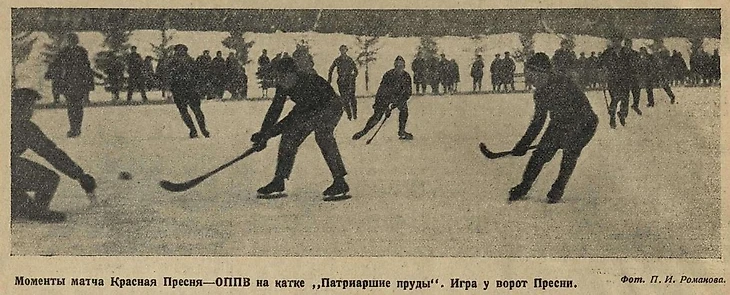 20 декабря 1925 года. Москва. Каток на Патриарших (Пионерских) прудах. Первенство Москвы. «Красная Пресня» (Кружок физической культуры Клуба Красно-Пресненского райкома РКСМ) - ОППВ - 2:4 (1:1). «Игра у ворот «Пресни» (фото П. Романова из двухнедельного иллюстрированного журнала «Известия физической культуры» № 1 за январь 1926 года)