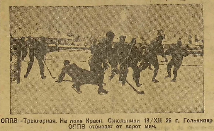 19 декабря 1926 года. Москва. Стадион «Красные Сокольники» (Стромынка, 4). Первенство Москвы. ОППВ - «Трехгорная мануфактура» - 2:1. «Голкипер ОППВ отбивает от ворот мяч» (газета «Красный спорт» № 52 от 26 декабря 1926 года)