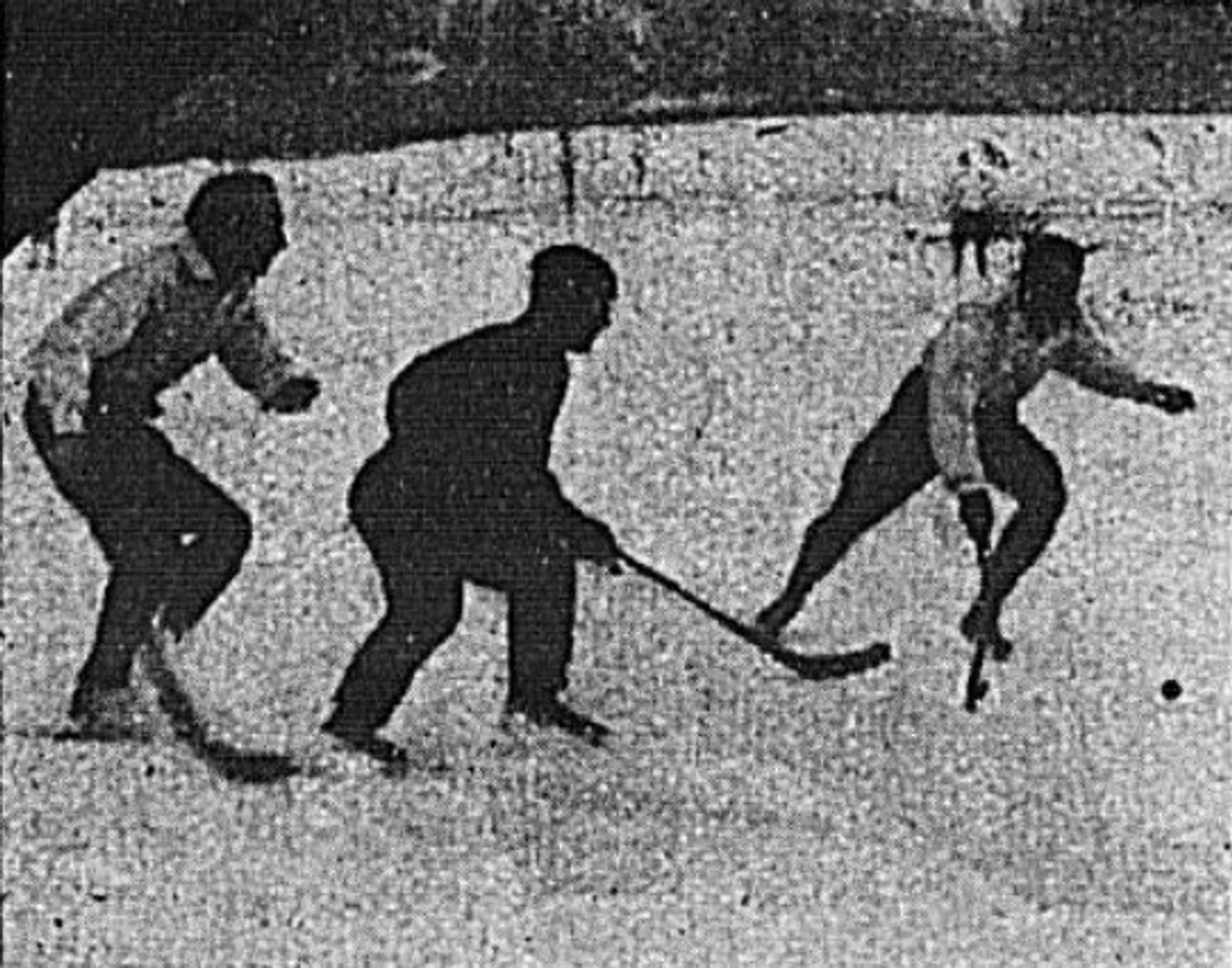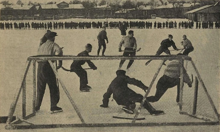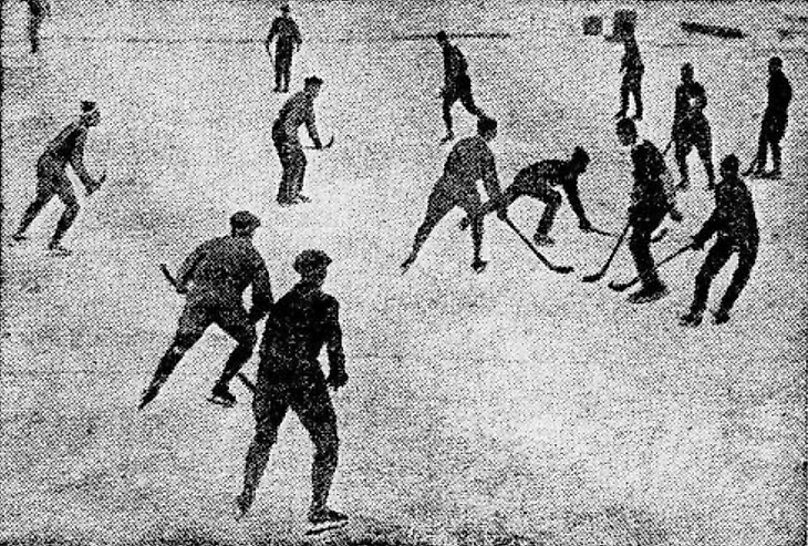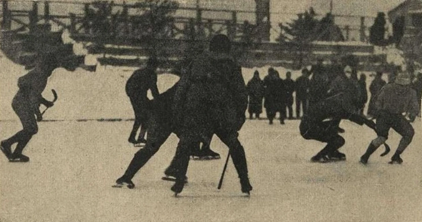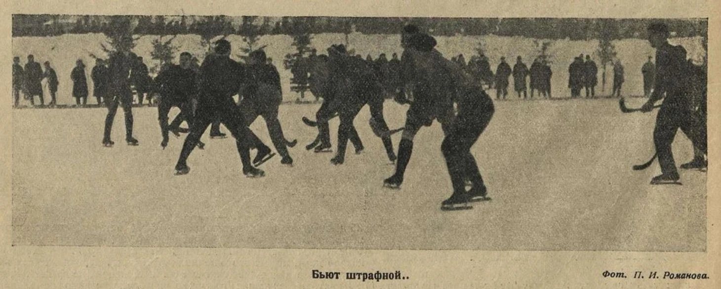 20 декабря 1925 года. Москва. Каток на Патриарших (Пионерских) прудах. Первенство Москвы. «Красная Пресня» (Кружок физической культуры Клуба Красно-Пресненского райкома РКСМ) - ОППВ - 2:4 (1:1). «Бьют штрафной...» (фото П. Романова из двухнедельного иллюстрированного журнала «Известия физической культуры» № 1 за январь 1926 года)
