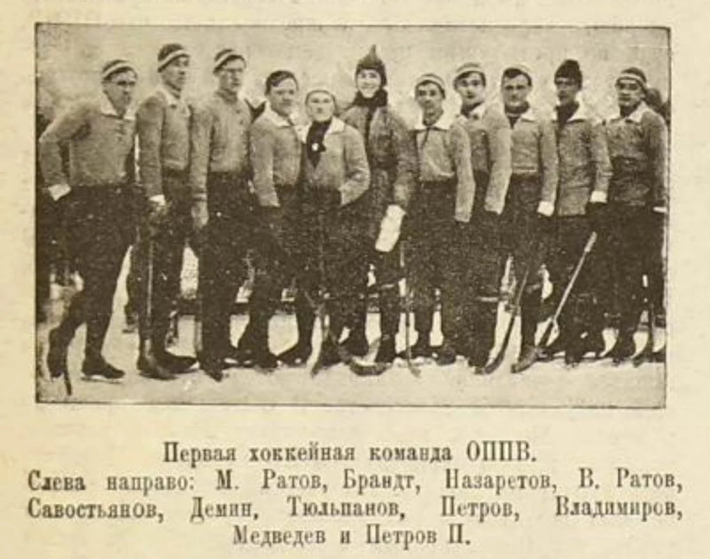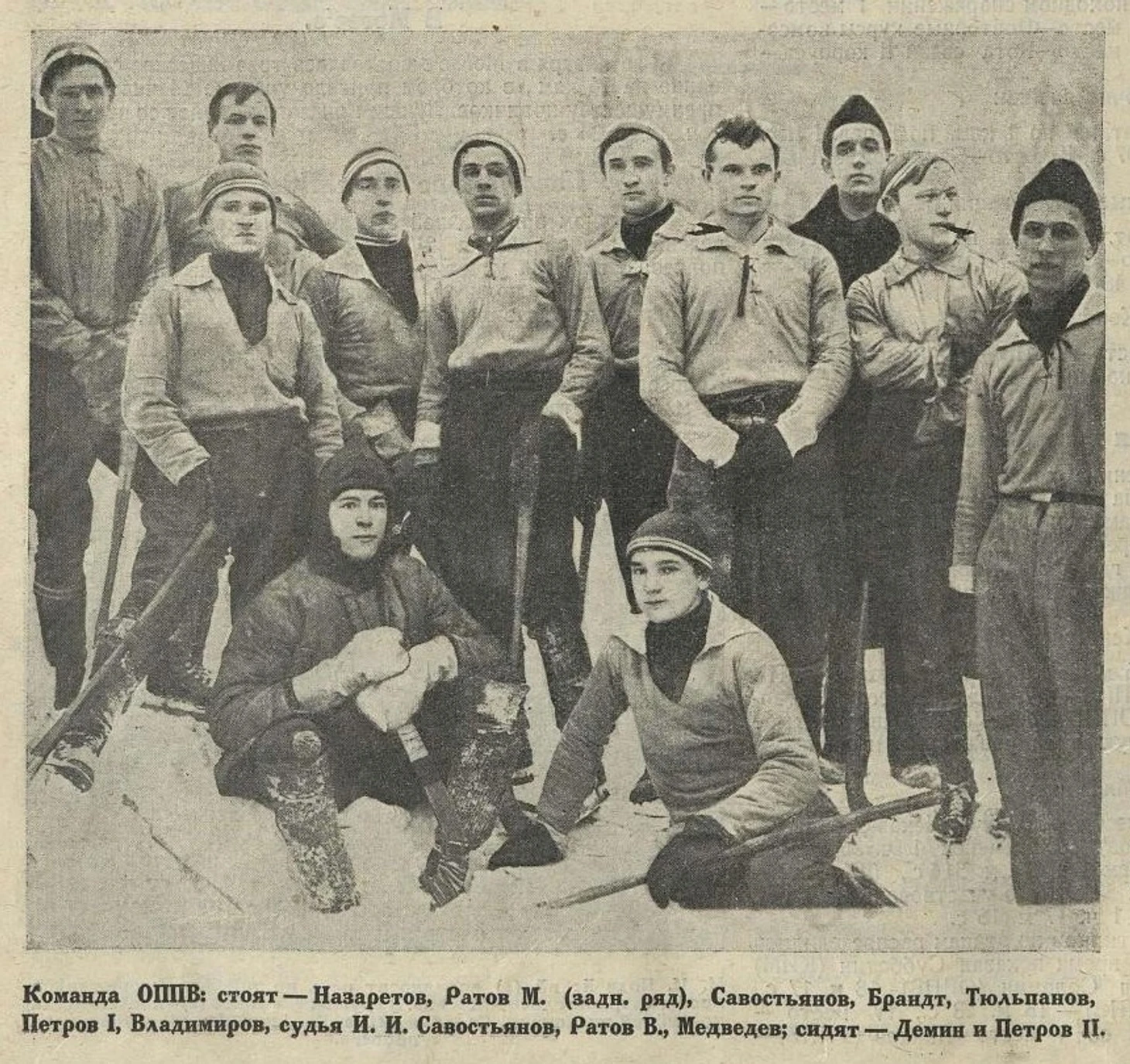 Январь 1924 года. Хоккейная команда Опытно-показательной военно-спортивной площадки «Всевобуч» / ОППВ (слева направо): центральный полузащитник Михаил Ратов, левый крайний нападающий Лев Брандт, правый защитник Сергей Назаретов, правый полузащитник Владимир Ратов, правый полусредний нападающий Павел Савостьянов, вратарь Александр Дёмин, левый защитник Василий Тюльпанов, левый полузащитник Петров-I, центральный нападающий М. Владимиров, левый полусредний нападающий Медведев и правый крайний нападающий Петров-II (журнал «Красный спорт» № 2 за январь 1924 года)