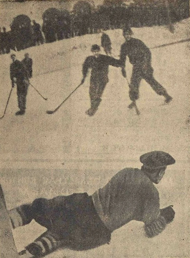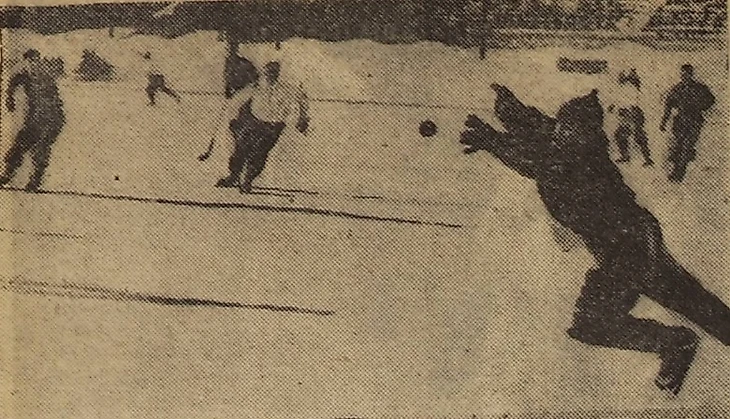 18 января 1937 года. Москва. Каток парка ЦДКА (Площадь Коммуны). Первенство Москвы. ЦДКА - «Спартак» - ЦДКА - 1:3 (1:1). «У ворот ЦДКА» (фото М. Квасного из газеты «Красный спорт» № 10 от января 1937 года)